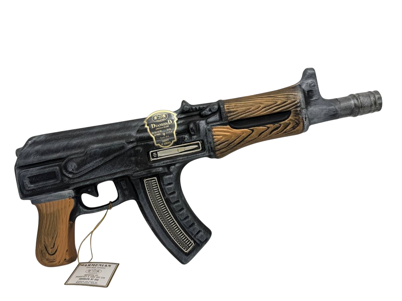 A distinctive brandy presented in a collectible ceramic bottle shaped like an automatic weapon. It offers rich, smooth flavors of dried fruit, vanilla, and oak with a warm, lingering finish.
